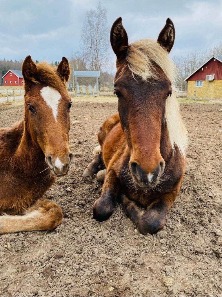 Här är mina två rocky-föl, han till vänster är Blaze min egen uppfödning. Till höger är Percy som flyttat till oss nyligen. De är jämngamla och hunnit bli riktigt goda vänner. Båda två är hingstföl, förra året fick jag tre hingstar….i år hoppas jag på stoföl.